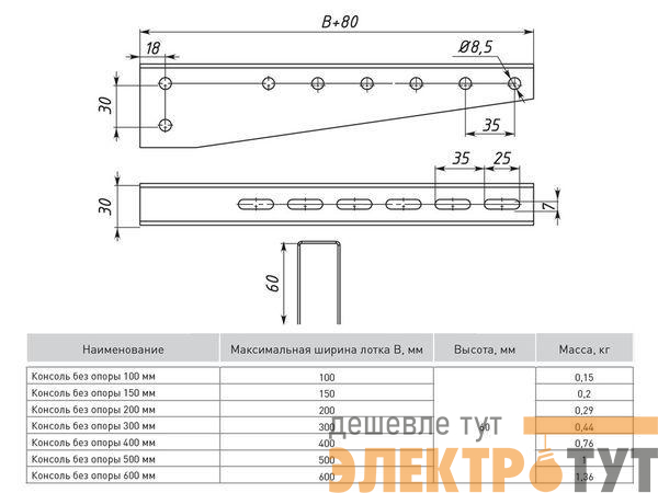 Консоль без опоры является облегченной версией монтажного кронштейна и применяется для малых и средних кабельных нагрузок. Монтаж осуществляется только совместно с профилями pp35120-1,5 (длина 120 мм.) или pp35180-1,5 (длина 180 мм).