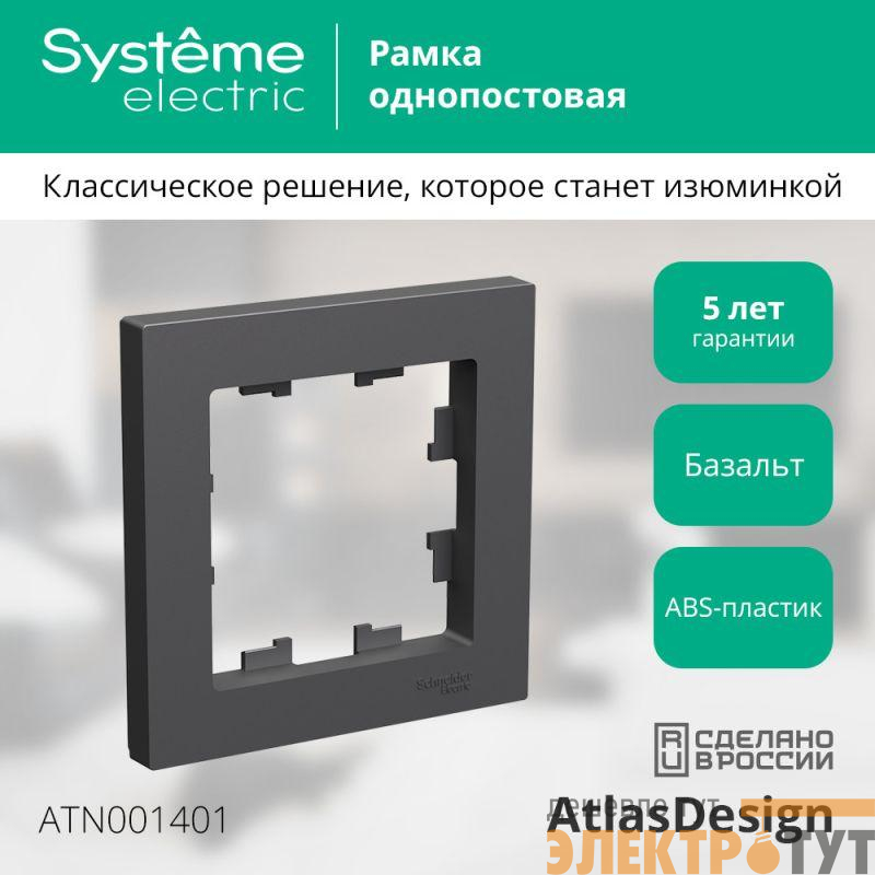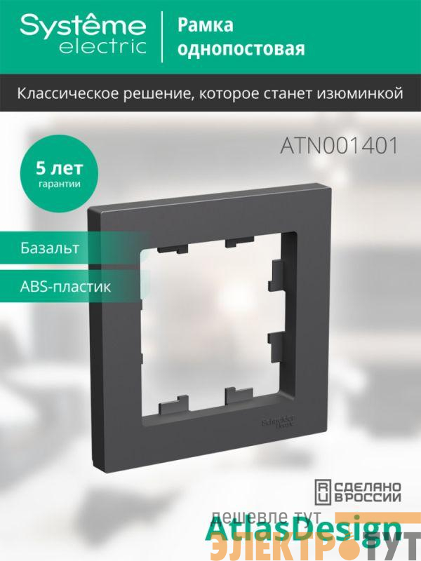 Рамка Systeme Electric (ранее Schneider Electric) серии AtlasDesign в цвете БАЗАЛЬТ одинарная.