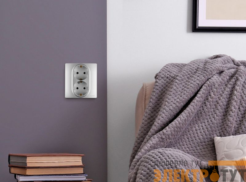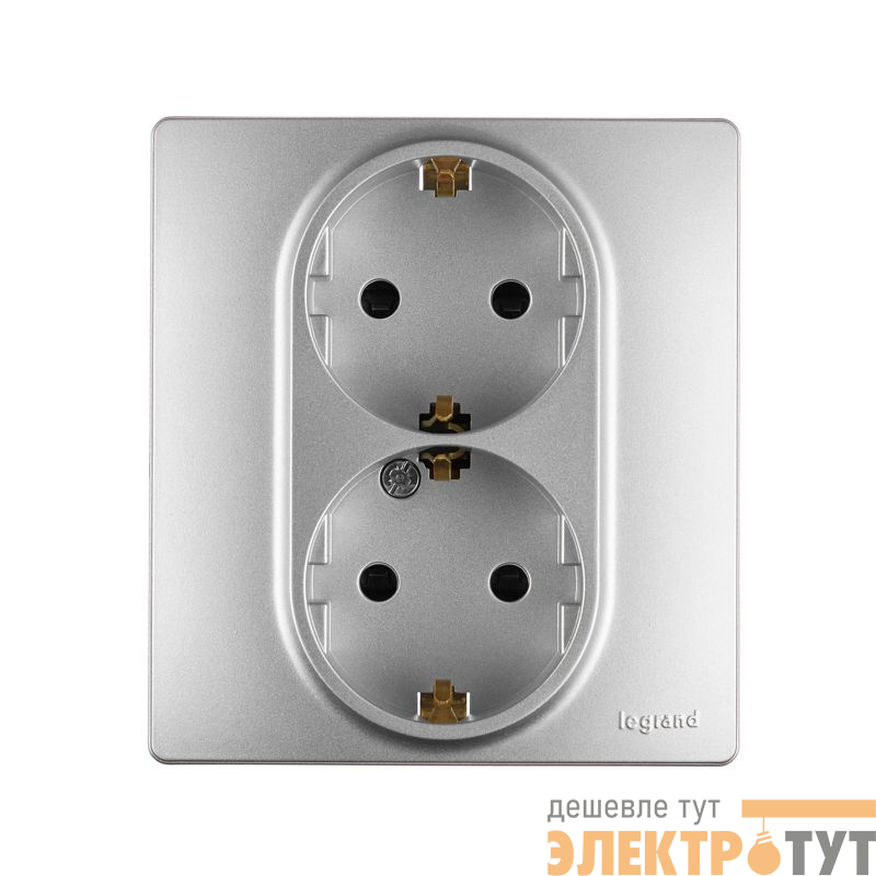 Розетка двойная с заземлением с защитными шторками Inspiria в сборе с рамкой для скрытого монтажа, цвет "Алюминий". Максимальный ток 16А, напряжение 250В~, максимальная мощность 3680Вт, безвинтовые зажимы. Применяется для электропитания в зданиях с проводкой с заземлением (с защитным проводником). Позволяет компактно разместить две розетки в одном установочном месте.