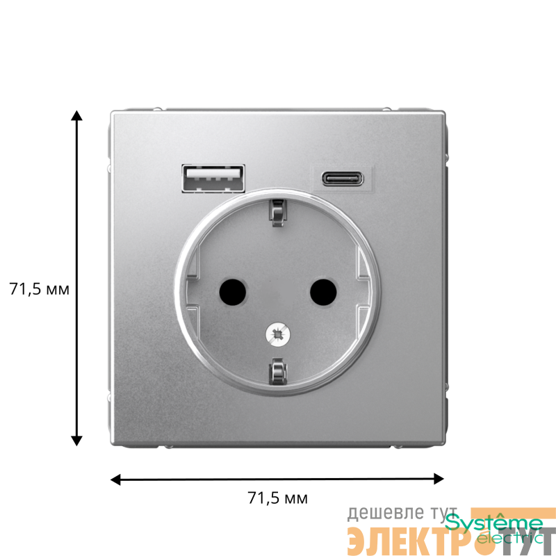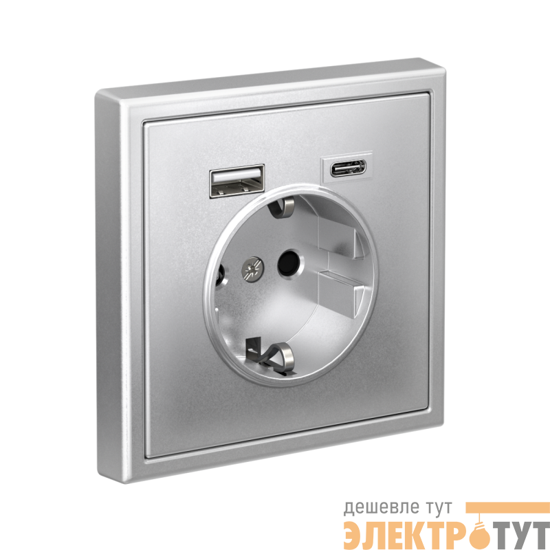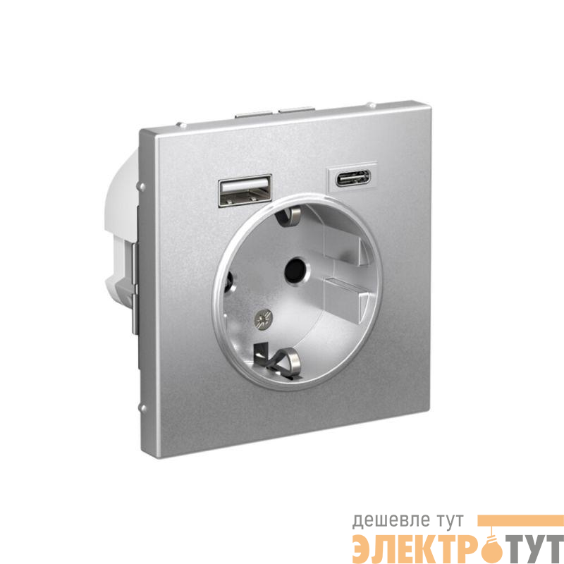 Розетка силовая Systeme Electric серии ArtGallery 16А в цвете алюминий с заземлением и шторками с розеткой USB, с двумя разъемами тип А и тип С. Розетка совмещает в себе сразу 3 функции в одном изделии. Удобное и современное решение для дома, офиса и других помещений.