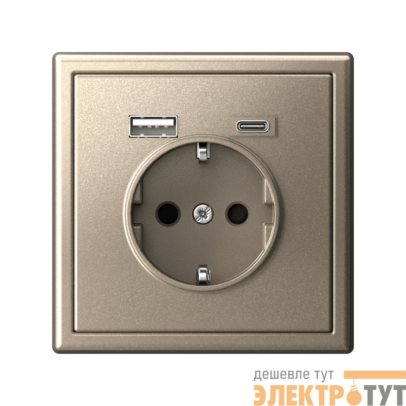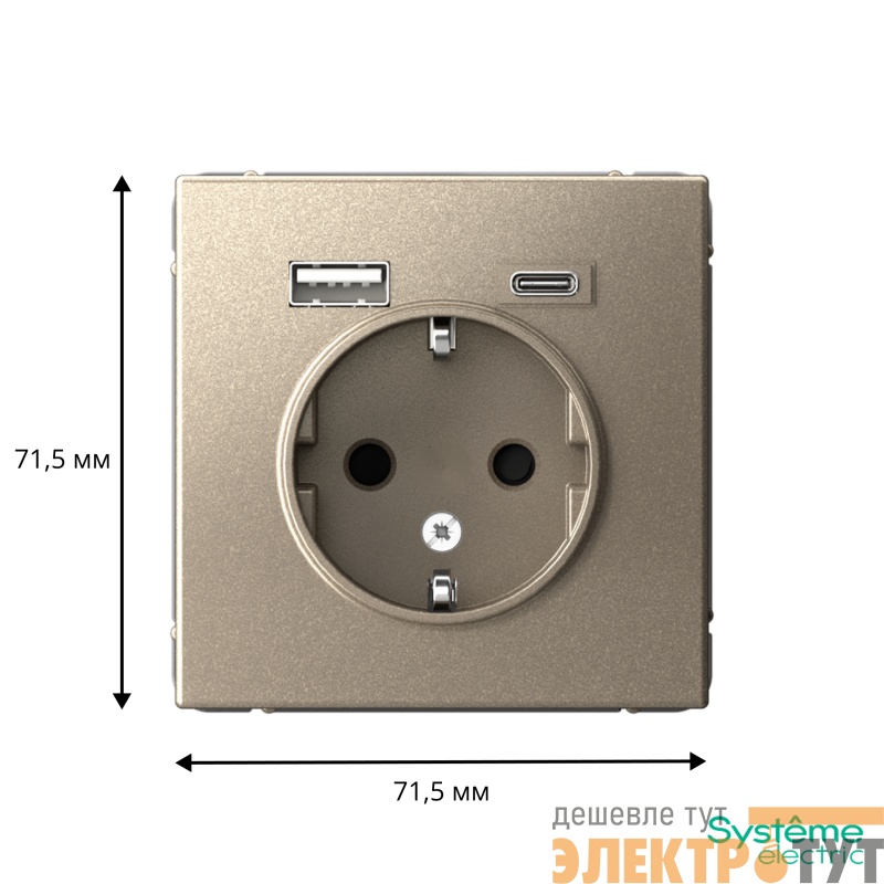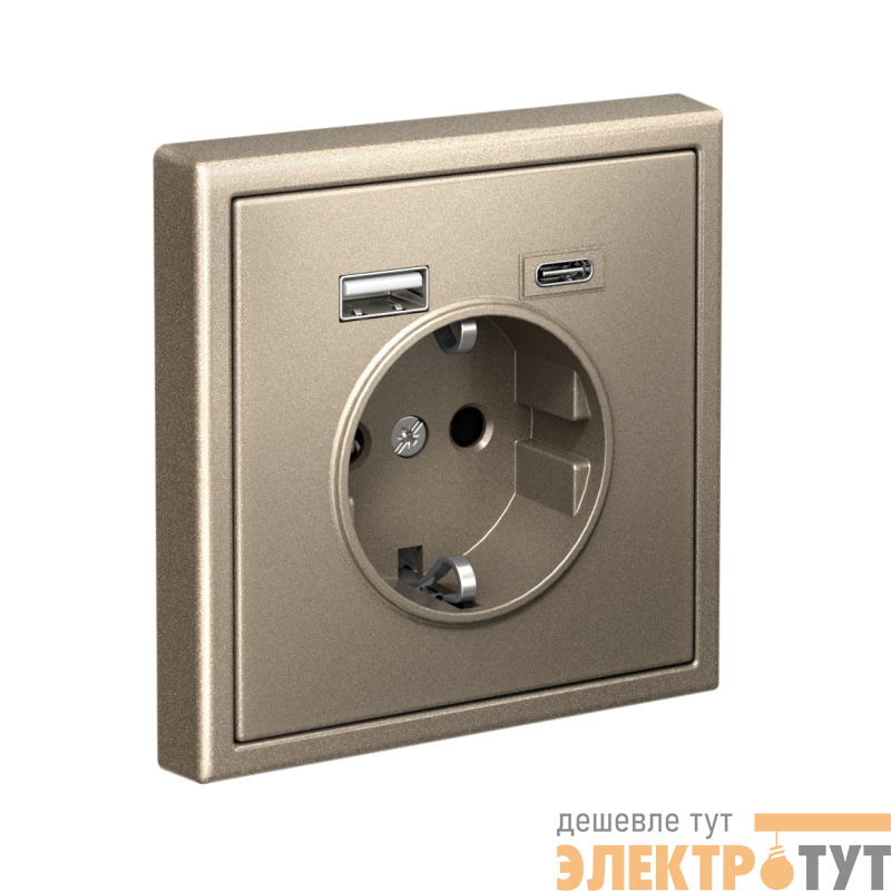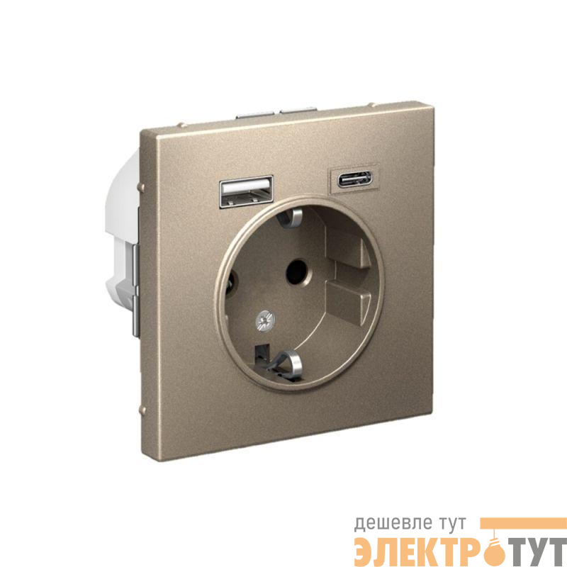 Розетка силовая Systeme Electric серии ArtGallery 16А в цвете шампань с заземлением и шторками с розеткой USB, с двумя разъемами тип А и тип С. Розетка совмещает в себе сразу 3 функции в одном изделии. Удобное и современное решение для дома, офиса и других помещений.