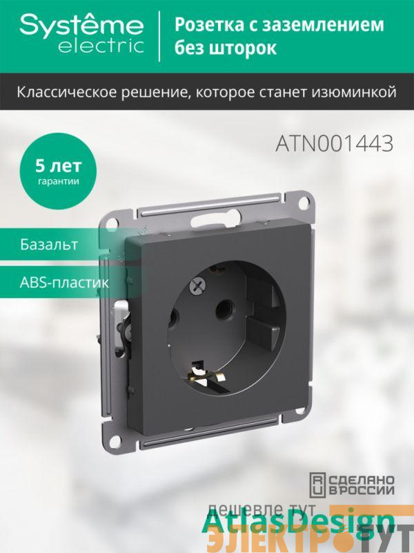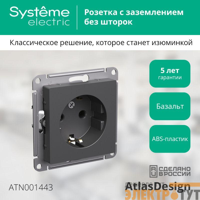 Механизм Systeme Electric (ранее Schneider Electric) серии AtlasDesign в цвете БАЗАЛЬТ розетки одинарной с заземлением и без шторок подходит для сетей 250 В, на ток 16 А.