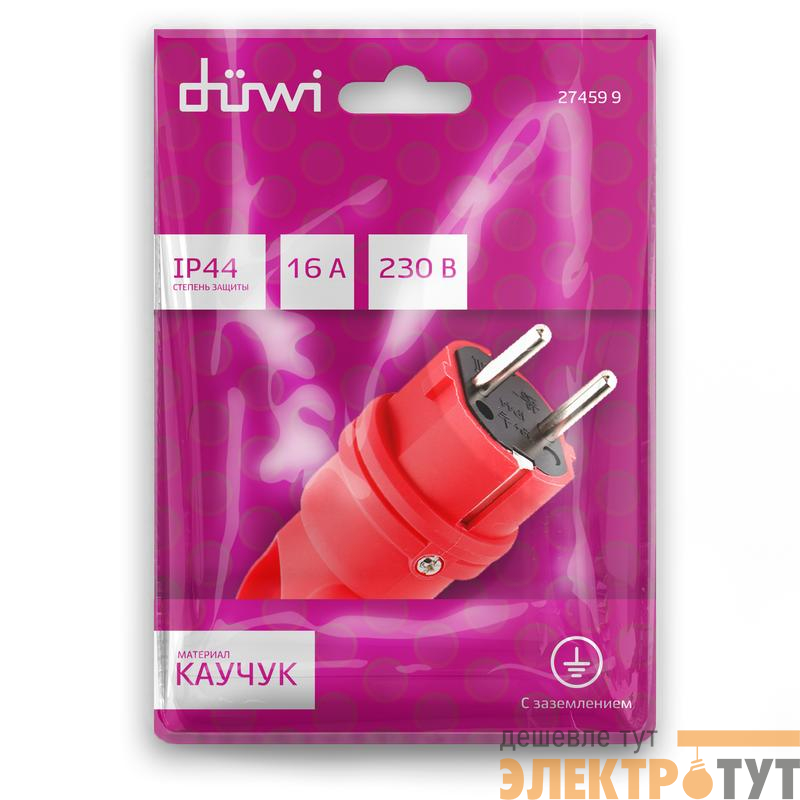 27459 9 | Вилка каучуковая прямая с/з 90град. с кольцом 16А 230В IP44 красн. Duwi