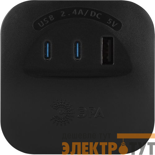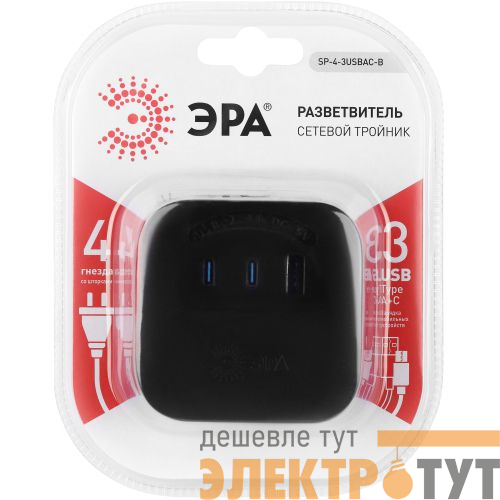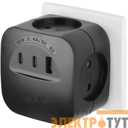 Тройник (адаптер) ЭРА с 4-мя розетками и 3-мя USB A+C гнездами для зарядки портативных устройств. Идеален для зарядки мобильных телефонов и планшетов. Незаменим с собой в дороге. Особенно актуален когда в помещении мало источников подключения - можно из одной розетки сделать четыре и при этом ещё заряжать устройства одновременно через USB. Максимальная мощность USB разъемов: 2400 мА.