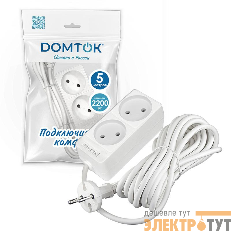 2347 | Удлинитель 2х5м без заземл. 10А IP20 2.2кВт ПВС 2х1 бел. DOMTOK