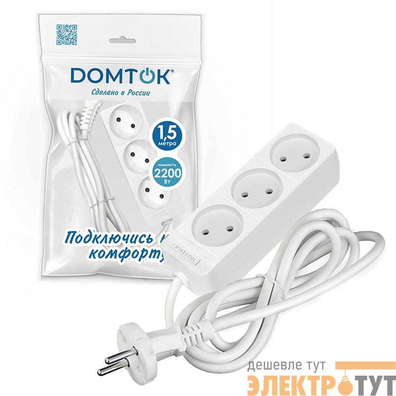 2349 | Удлинитель 3х1.5м без заземл. 10А IP20 2.2кВт ПВС 2х1 бел. DOMTOK