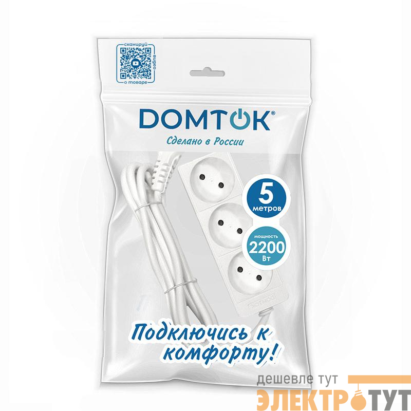 2372 | Удлинитель 3х5м без заземл. 10А IP20 2.2кВт ПВС 2х0.75 бел. DOMTOK