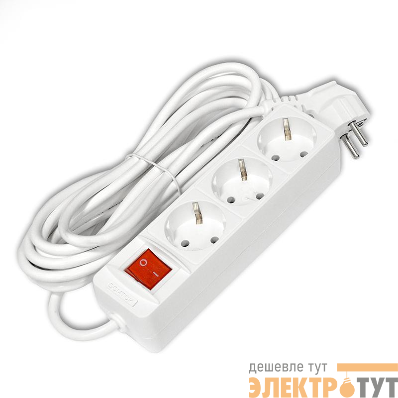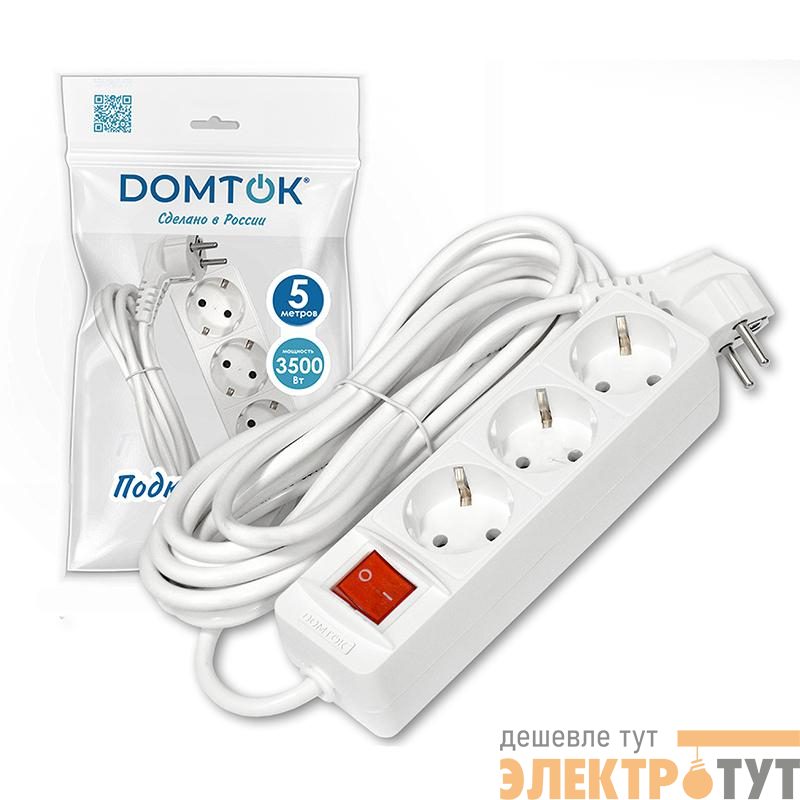 2382 | Удлинитель 3х5м с заземл. 16А IP20 3.5кВт ПВС 3х1 с выкл. бел. DOMTOK
