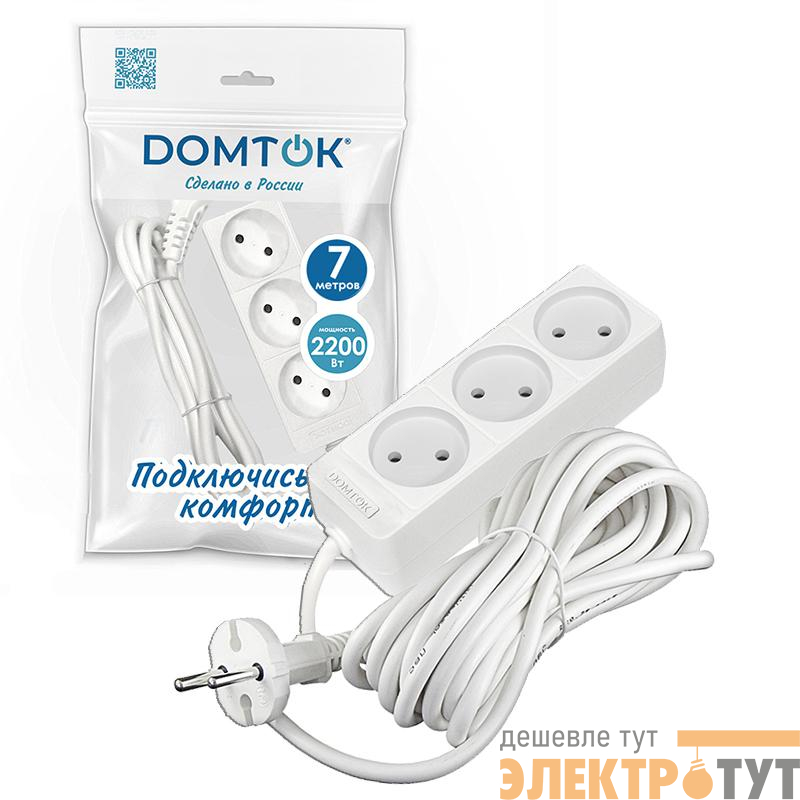2353 | Удлинитель 3х7м без заземл. 10А IP20 2.2кВт ПВС 2х1 бел. DOMTOK