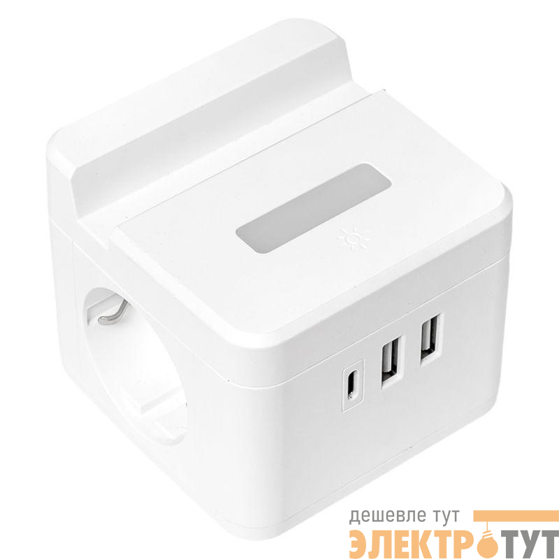 Удлинитель «Куб» 2 гнезда USB + 2 Type C с быстрой зарядкой, подставкой под телефон и ночником 1,3 метра 1 кв.мм предназначен для подключения к электрической сети всех видов бытовой и офисной техники, для зарядки и питания устройств через порты USB, а также для подсветки помещений в качестве ночника.