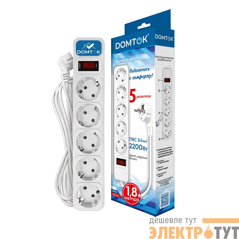 2527 | Удлинитель с сетевым фильтром 5х1.8м с заземл 10А IP20 2.2кВт ПВС 3х1 с выкл. бел. DOMTOK