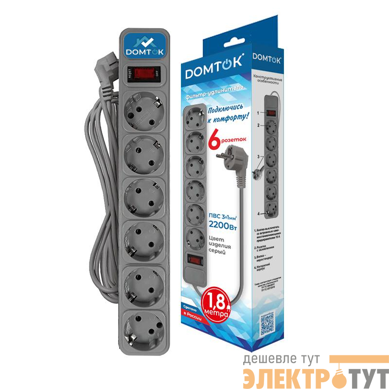 2518 | Удлинитель с сетевым фильтром 6х1.8м с заземл 10А IP20 2.2кВт ПВС 3х1 с выкл. сер. DOMTOK