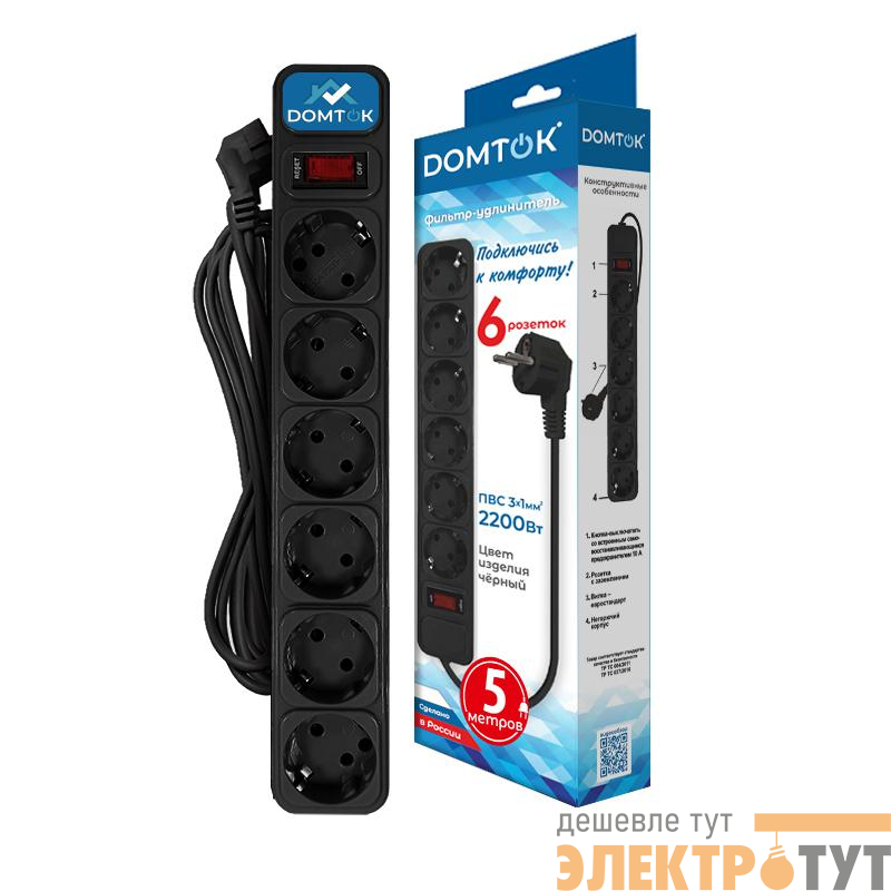 2523 | Удлинитель с сетевым фильтром 6х5м с заземл 10А IP20 2.2кВт ПВС 3х1 с выкл. черн. DOMTOK