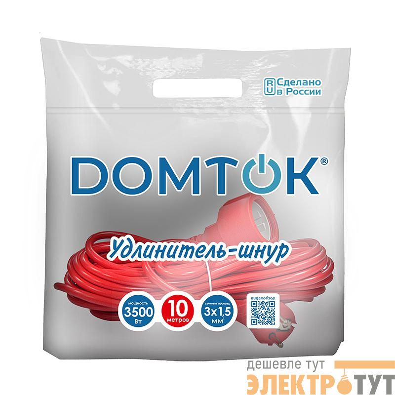 2496 | Удлинитель-шнур 1х10м с заземл. 16А IP20 3.5кВт ПВС 3х1.5 DOMTOK