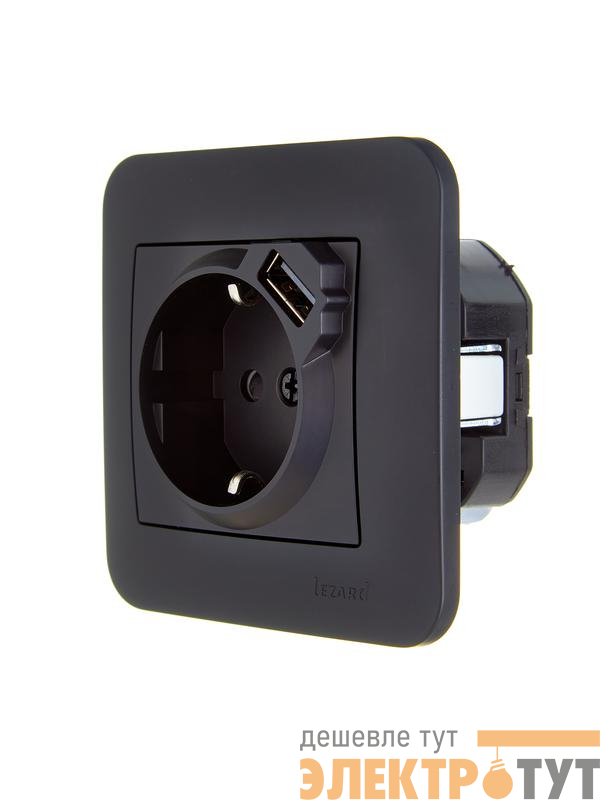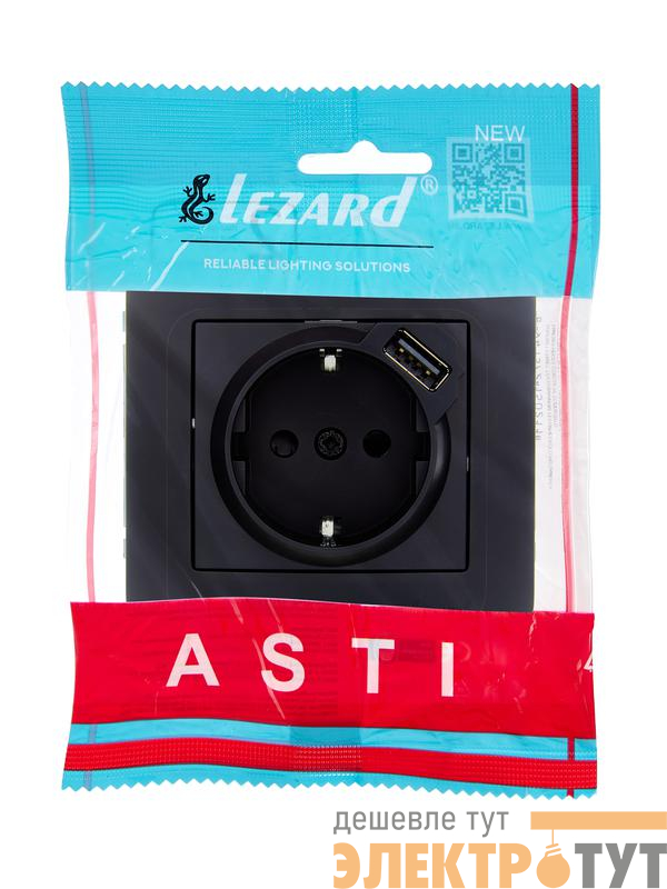 7081-4242-181 | Розетка 1-м СП ASTI 16А IP20 с заземл. с заряд. устройством USB в сборе черн. бархат. LEZARD