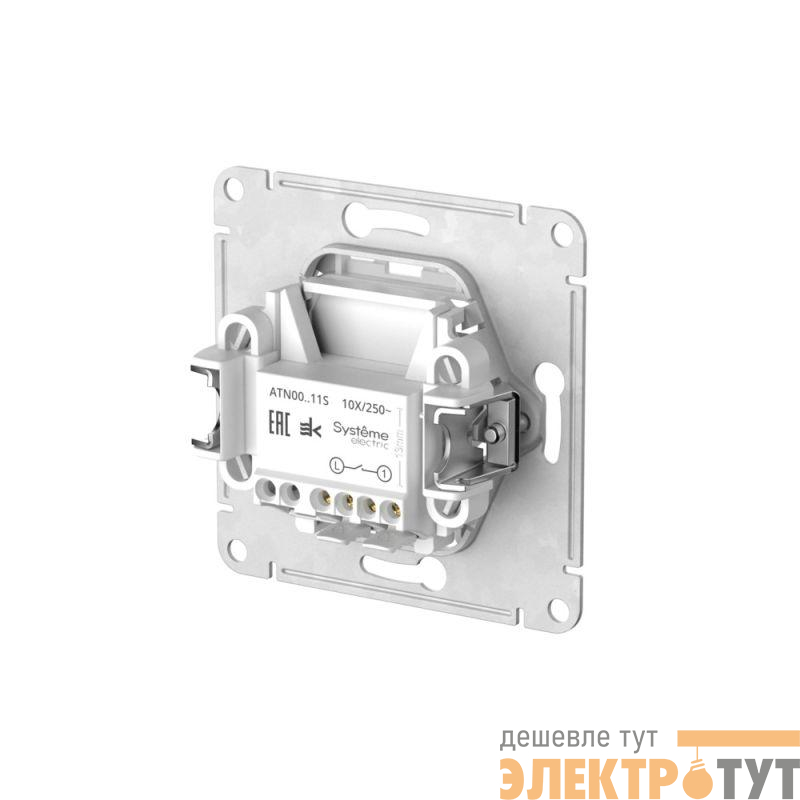 Механизм с быстрозажимными клеммами выключателя 1-клавишного Systeme Electric (ранее Schneider Electric) серии AtlasDesign в цвете алюминий подходит для сетей 250 В, на ток 10 А.