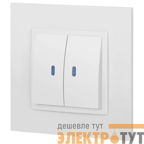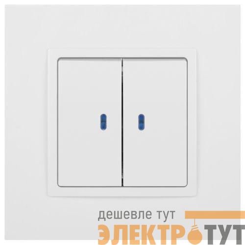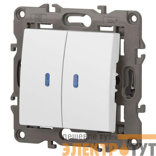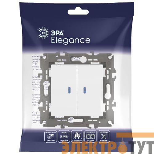 Выключатель 2-клавишный с подсветкой серии Эра Elegance цвет белый матовый 14-1105-01М. Характеристики 10А 250В. Оснащён автоматическими клеммами для надёжной фиксации жил кабеля в механизме. Рамки приобретаются отдельно.
