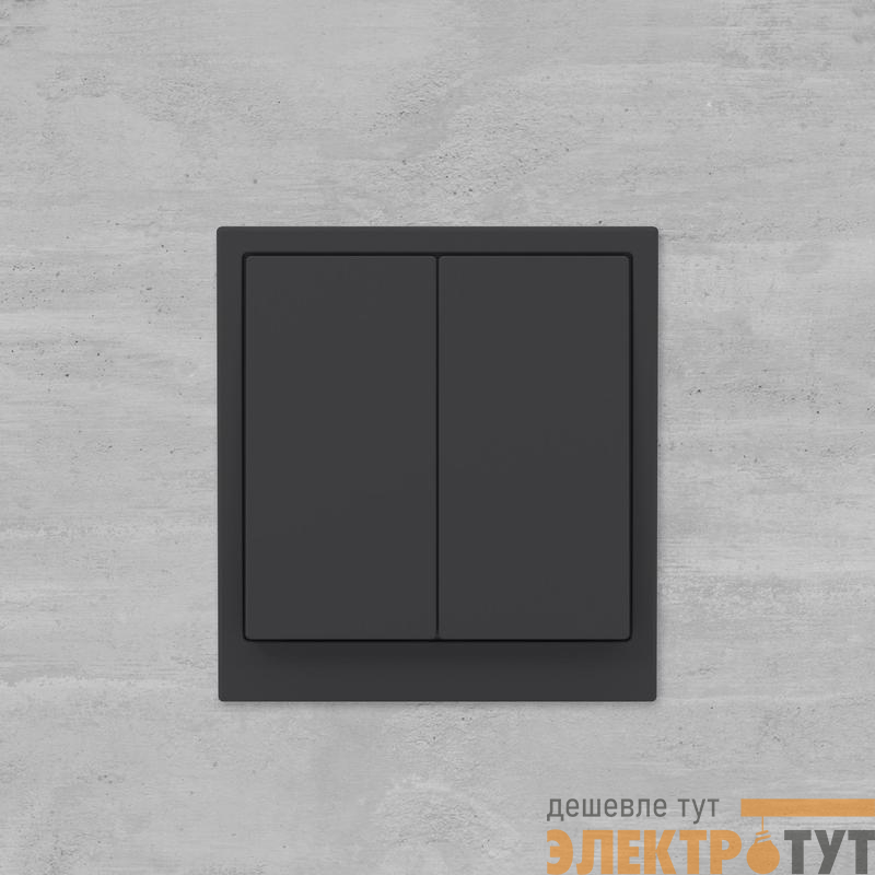 Двухклавишный выключатель применяется для управления двумя контурами освещения. Выключатель предназначен для скрытого монтажа в стену. Характеристики устройства: номинальное напряжение 250 В, номинальный ток 16 А. Материал: металл, поликарбонат. Пластиковые элементы имеют цвет "Черный уголь". Для декоративного оформления электроустановочных изделий используются рамки серии "KANT".