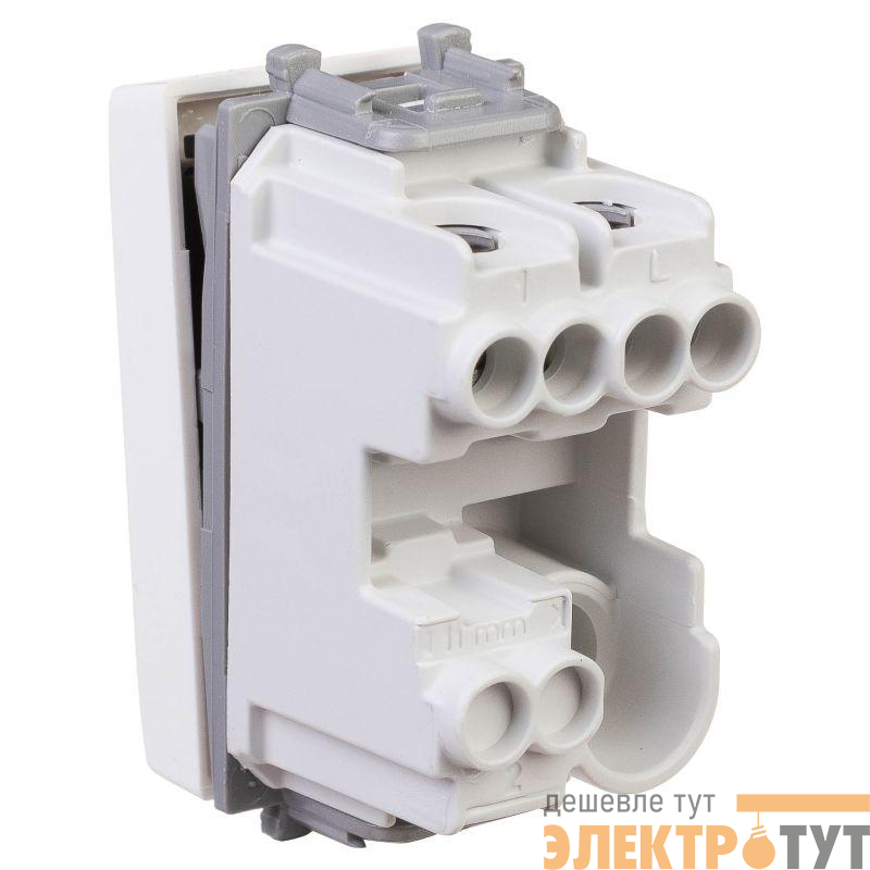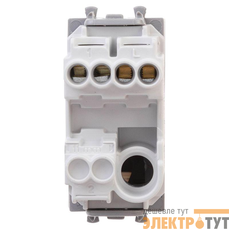 Выключатель одноклавишный однополюсный, модульный. Предназначен для монтажа в системы "In-liner Front" и "In-liner Aero" при помощи рамок-суппортов и каркасов "Avanti" (код 4400912 и т.д.); используется для включения/выключения освещения. Характеристики: диаметр отверстий для ввода кабелей – 3 мм (по 2 отверстия на одну клемму); винтовые зажимы; шаблон для зачистки кабеля – 11 мм; номинальный ток – 16 A; номинальное напряжение – 230 В; возможна фиксация в подрозеточные коробки при помощи каркаса с лапками (код 4400802) и саморезов. 1 модуль. Цвет: "Белое облако".