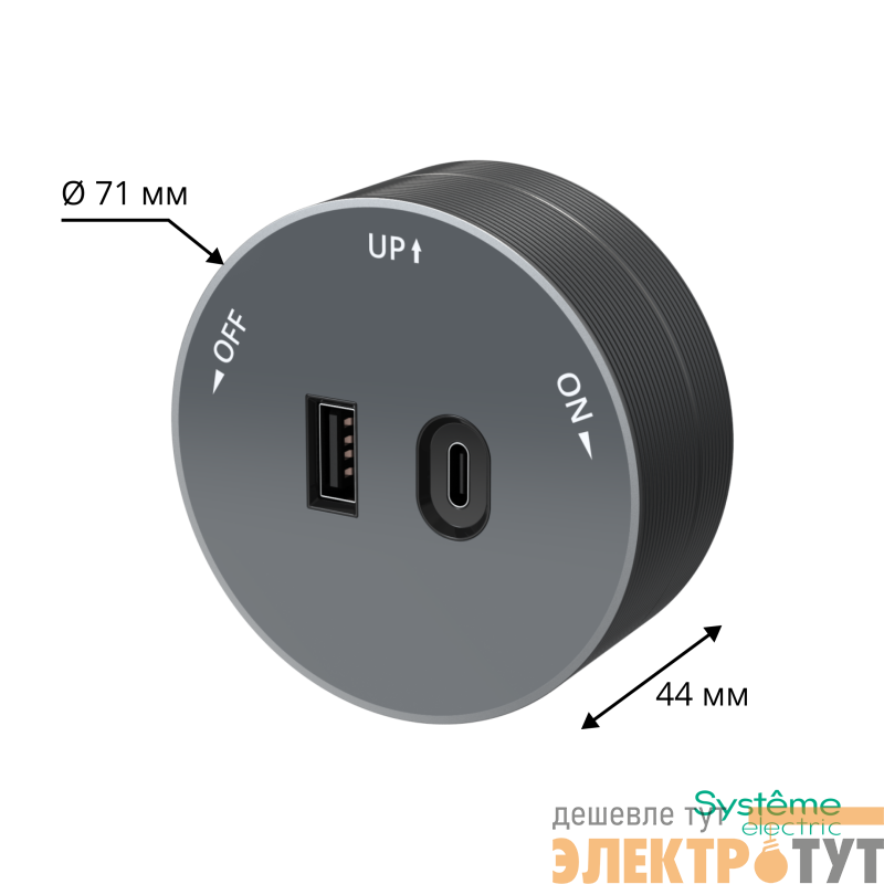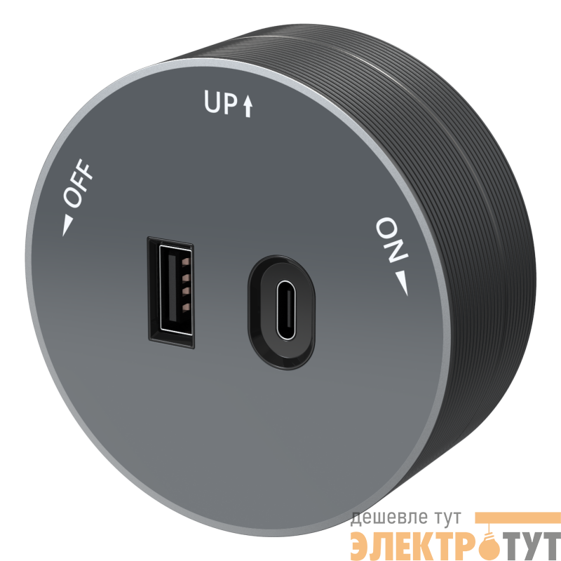 Розетка трековой системы MultiTrack (Systeme Electric) 2хUSB (тип А + тип С) 18 Вт, 5В/3А, 9В/2А, 12В/1.5А, цвет - графит. Устанавливается в шину MultiTrack. Быстрая и безопасная установка, не требующая привлечения специалиста: достаточно вставить розетку в шину и повернуть на 90 градусов до упора.