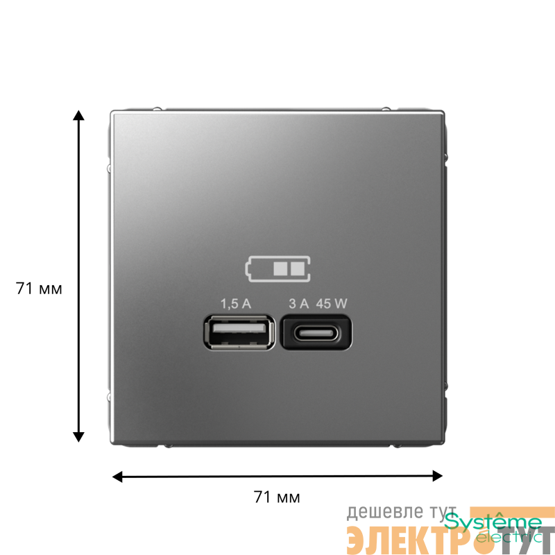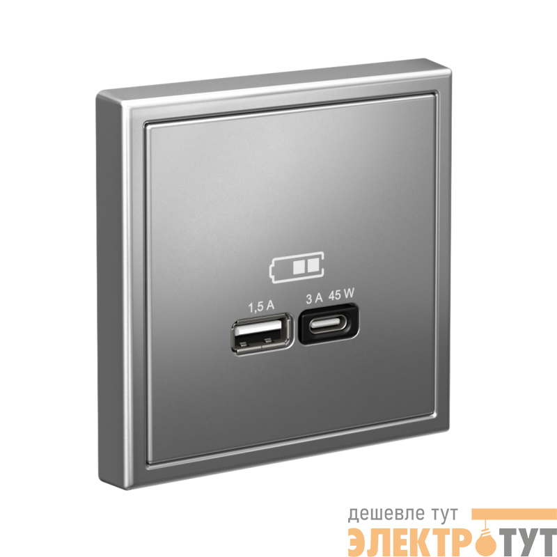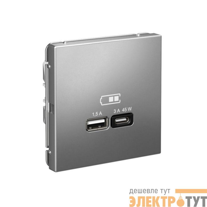 Розетка Systeme Electric серии ArtGallery в цвете сталь двойная USB с разъемами типа A+C высокоскоростная.