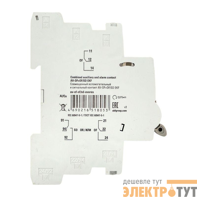 Совмещенные вспомогательные и сигнальные контакты AV-OF+OF/SD. EKF предназначены для применения во вспомогательных цепях управления, сигнализации переменного и постоянного тока. Функция дополнительного контакта AV-OF информирует о состоянии ВКЛ-ОТКЛ контактов аппарата, а функция сигнального контакта информирует о срабатывании аппарата по аварии (AV-6, AV-10, DV, DVA-6, DVA-10, AVN до 63А, ВА 47-63N, ВН-63N), к которому он присоединен.