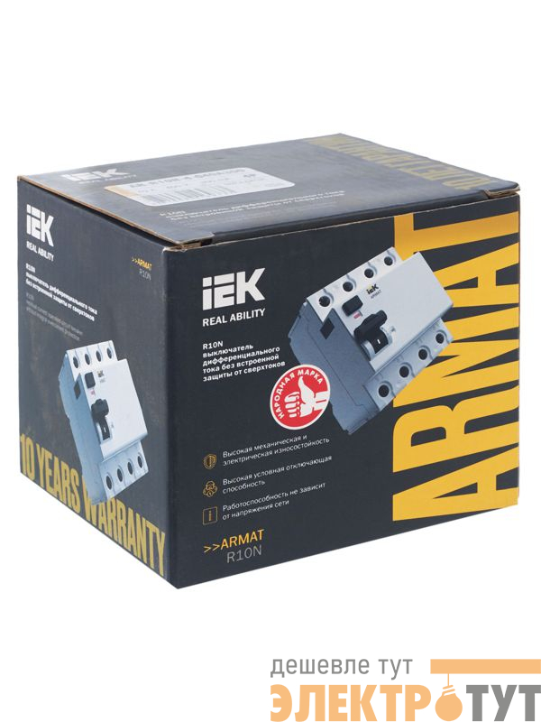 Выключатели дифференциального тока ARMAT серии R10N выполняют функцию защиты поражения человека электрическим током, а так же защиты от пожара при возникновении замыкания на землю. Модельный ряд включает в себя устройства с типами защитных характеристик по дифференциальному току AC, A, AC-S, A-S; номинальными токами от 25 до 100 А; номинальными дифференциальными токами срабатывания от 10 до 300мА. Условная отключающая способность ВДТ ARMAT серии R10N составляет 10 кА.