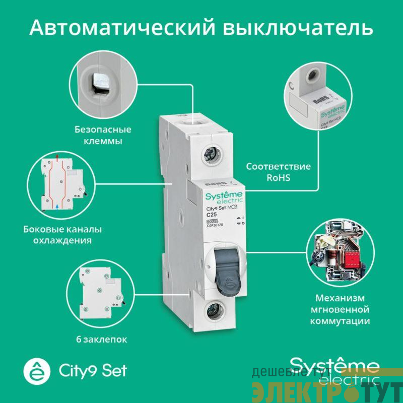 Автоматический выключатель серии City9 Set Systeme Electric, 1-полюсный, номинальный ток 25 А, характеристика С, Icn = 6 кА. Применяется в электрических сетях напряжением 230 В. Предназначен для защиты от перегрузок и токов короткого замыкания. Оснащен механизмом «мгновенной коммутации». Ударопрочный корпус из специального пластика с 6 металлическими заклепками. Безопасные клеммы исключают попадание кабелей в заклеммное пространство.