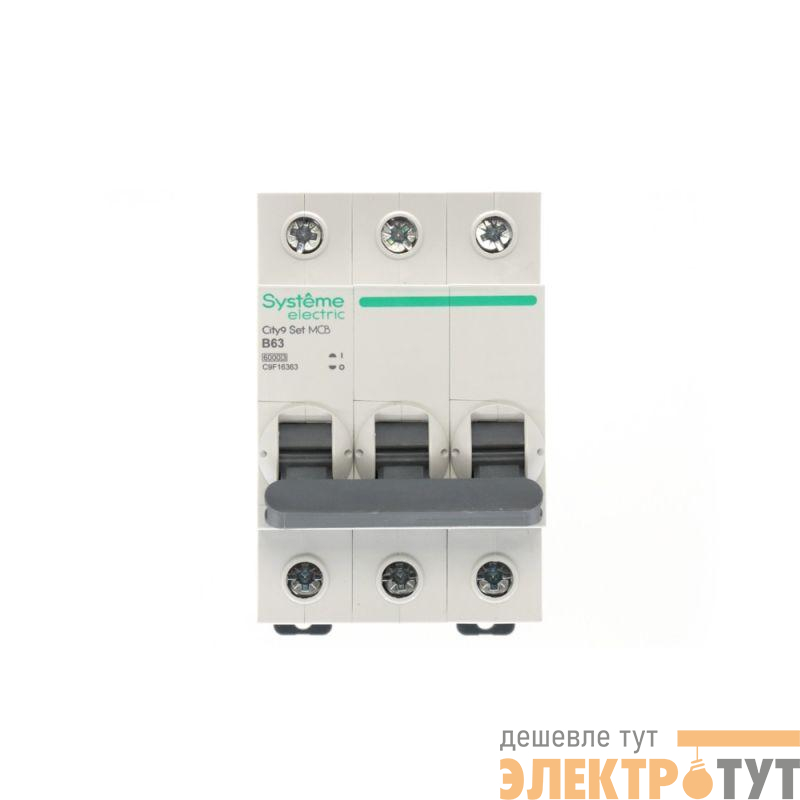 Автоматический выключатель серии City9 Set Systeme Electric, 3-полюсный, номинальный ток 63 А, характеристика B, Icn = 6 кА. Применяется в электрических сетях напряжением 400 В. Предназначен для защиты от перегрузок и токов короткого замыкания. Оснащен механизмом «мгновенной коммутации». Ударопрочный корпус из специального пластика с 6 металлическими заклепками. Безопасные клеммы исключают попадание кабелей в заклеммное пространство (ранее Schneider Electric R9F02363).