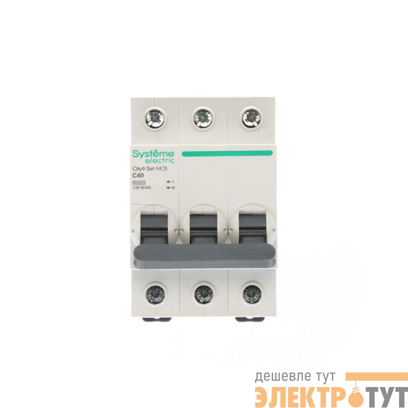 Автоматический выключатель серии City9 Set Systeme Electric, 3-полюсный, номинальный ток 40 А, характеристика С, Icn = 6 кА. Применяется в электрических сетях напряжением 400 В. Предназначен для защиты от перегрузок и токов короткого замыкания. Оснащен механизмом «мгновенной коммутации». Ударопрочный корпус из специального пластика с 6 металлическими заклепками. Безопасные клеммы исключают попадание кабелей в заклеммное пространство (ранее Schneider Electric R9F12340).
