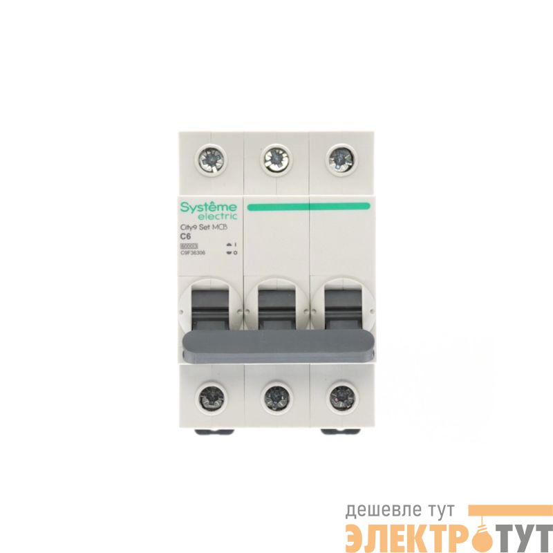Автоматический выключатель серии City9 Set Systeme Electric, 3-полюсный, номинальный ток 6 А, характеристика С, Icn = 6 кА. Применяется в электрических сетях напряжением 400 В. Предназначен для защиты от перегрузок и токов короткого замыкания. Оснащен механизмом «мгновенной коммутации». Ударопрочный корпус из специального пластика с 6 металлическими заклепками. Безопасные клеммы исключают попадание кабелей в заклеммное пространство (ранее Schneider Electric A9K24306, R9F12306).
