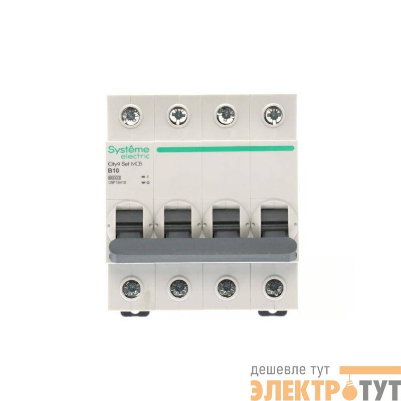 Автоматический выключатель серии City9 Set Systeme Electric, 4-полюсный, номинальный ток 10 А, характеристика B, Icn = 6 кА. Применяется в электрических сетях напряжением 400 В. Предназначен для защиты от перегрузок и токов короткого замыкания. Оснащен механизмом «мгновенной коммутации». Ударопрочный корпус из специального пластика с 6 металлическими заклепками. Безопасные клеммы исключают попадание кабелей в заклеммное пространство (ранее Schneider Electric R9F02410).