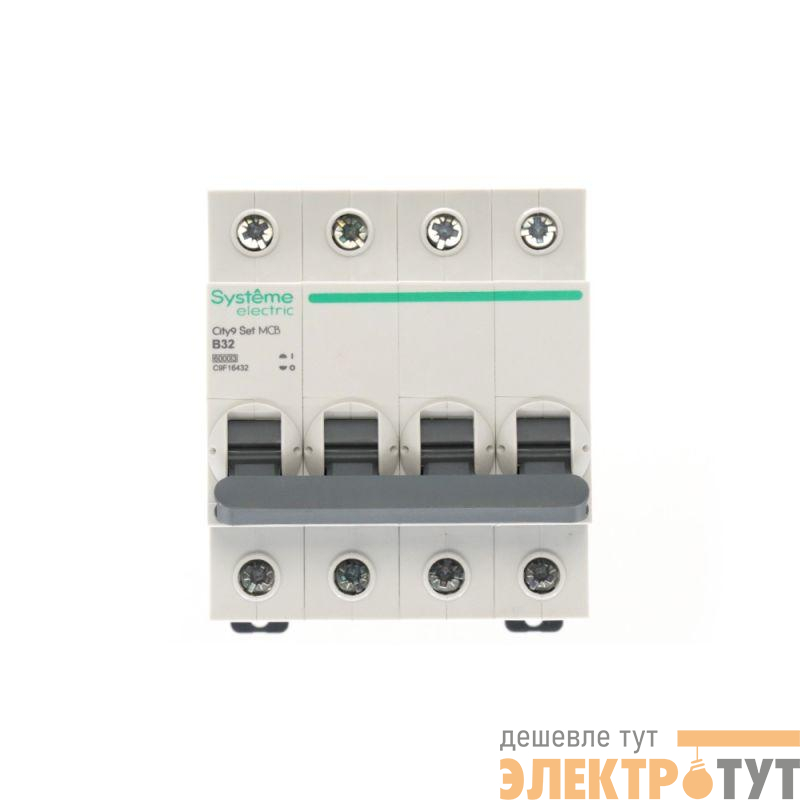 Автоматический выключатель серии City9 Set Systeme Electric, 4-полюсный, номинальный ток 32 А, характеристика B, Icn = 6 кА. Применяется в электрических сетях напряжением 400 В. Предназначен для защиты от перегрузок и токов короткого замыкания. Оснащен механизмом «мгновенной коммутации». Ударопрочный корпус из специального пластика с 6 металлическими заклепками. Безопасные клеммы исключают попадание кабелей в заклеммное пространство (ранее Schneider Electric R9F02432).