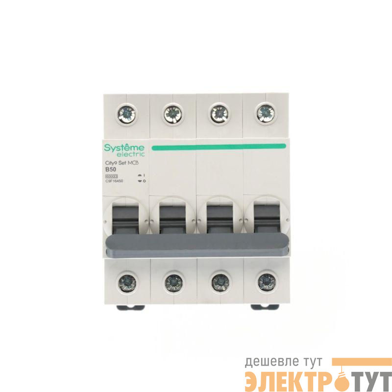 Автоматический выключатель серии City9 Set Systeme Electric, 4-полюсный, номинальный ток 50 А, характеристика B, Icn = 6 кА. Применяется в электрических сетях напряжением 400 В. Предназначен для защиты от перегрузок и токов короткого замыкания. Оснащен механизмом «мгновенной коммутации». Ударопрочный корпус из специального пластика с 6 металлическими заклепками. Безопасные клеммы исключают попадание кабелей в заклеммное пространство (ранее Schneider Electric R9F02450).