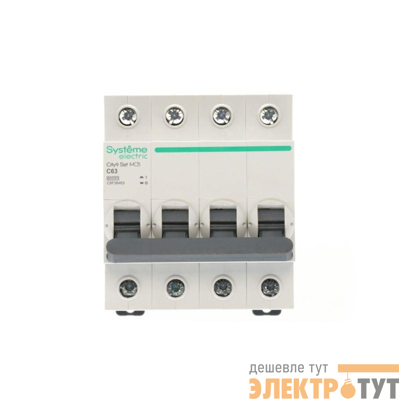 Автоматический выключатель серии City9 Set Systeme Electric, 4-полюсный, номинальный ток 63 А, характеристика С, Icn = 6 кА. Применяется в электрических сетях напряжением 400 В. Предназначен для защиты от перегрузок и токов короткого замыкания. Оснащен механизмом «мгновенной коммутации». Ударопрочный корпус из специального пластика с 6 металлическими заклепками. Безопасные клеммы исключают попадание кабелей в заклеммное пространство (ранее Schneider Electric A9K24463, R9F12463).