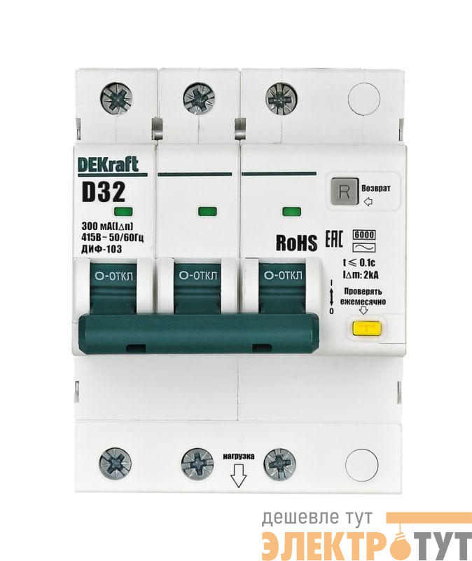 Автоматические выключатели дифференциального тока серии ДИФ-103 6кА NEW Dekraft; 3P; номинальный ток 32 А; ном. диф. ток 300 мА; тип диф. расцепителя - AC; кривая отключения - D; Icn, Ics = 6 кА; тип устройства - электронный; монтаж – на DIN-рейку. АВДТ обеспечивают три вида защиты — от короткого замыкания, перегрузки и возникновения утечки тока (в частности, вследствие прикосновения человека к токоведущим частям).