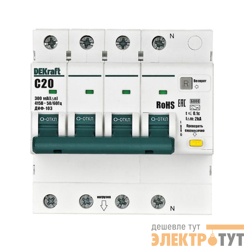 Автоматические выключатели дифференциального тока серии ДИФ-103 6кА NEW Dekraft; 3P+N; номинальный ток 20 А; ном. диф. ток 300 мА; тип диф. расцепителя - A; кривая отключения - С; Icn, Ics = 6 кА; тип устройства - электронный; монтаж – на DIN-рейку. АВДТ обеспечивают три вида защиты — от короткого замыкания, перегрузки и возникновения утечки тока (в частности, вследствие прикосновения человека к токоведущим частям).
