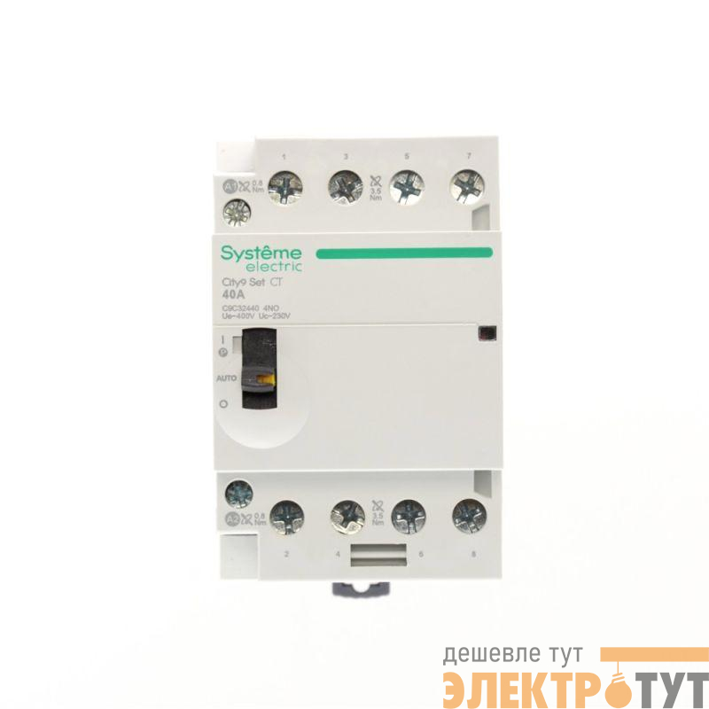 Контактор CT серии City9 Set Systeme Electric на номинальный ток 40 А (AC7a / AC7b), 4НО, номинальное напряжение силовой цепи - 400В, напряжение цепи управления - 230В, ширина 54 мм.<br />- В сочетании с автоматическими выключателями или АВДТ обеспечивают дистанционное управление в однофазных и трехфазных цепях переменного тока (освещение, отопление, вентиляция, жалюзи и т.п.)<br />- Управление неприоритетными нагрузками с помощью мастер-выключателя.<br />- Механический индикатор положения контактов. <br />- Крепление защёлкиванием на DIN-рейке шириной 35 мм.
