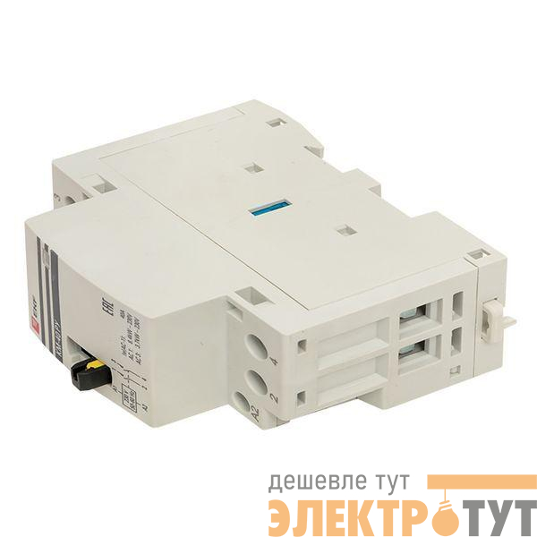 Модульные контакторы представляют из себя контактор в классическом корпусе модульного оборудования. Он состоит из неподвижных контактов, подвижных контактов, которые закреплены в подвижной части магнитной системы. Неподвижная часть магнитной системы закреплена жестко в корпусе КМ. Пружина препятствует смыканию контактов. При подаче напряжения на катушку управления в магнитной системе контактора возникает магнитное поле, которое, преодолевая сопротивление пружины, смыкает магнитную систему и замыкает контакты. При отключении напряжения с катушки управления пружина размыкает контакты. Возможна коммутация алюминиевым и медным проводом.