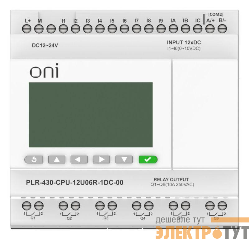 Модуль ЦПУ ПЛК 430 ONI с возможностью расширения количества каналов ввода-вывода и коммуникаций с помощью модулей расширения. С интегрированным полнофункциональным экраном. 12 дискретных входов, 6 из которых могут использоваться как аналоговые входы 0..10В, и 6 релейных выходов. Интегрированы 1 интерфейс RS485 и 1 интерфейс RS232. Напряжение питания 24 В DC.