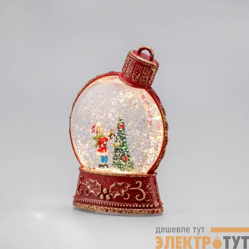 Светильник с эффектом снегопада и подсветкой выполнен в форме елочного шара, внутри которого находится фигурка ребенка, наряжающего елку.
