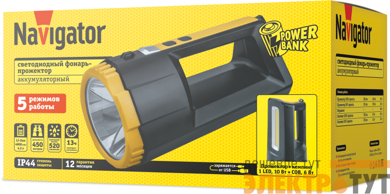 95567 | Фонарь-прожектор аккумуляторный 95 567 NPT-SP37-ACCU прожектор/кемпинг 1LED 10W+60COB 6Вт 4хli-ion 1.2А.ч Navigator