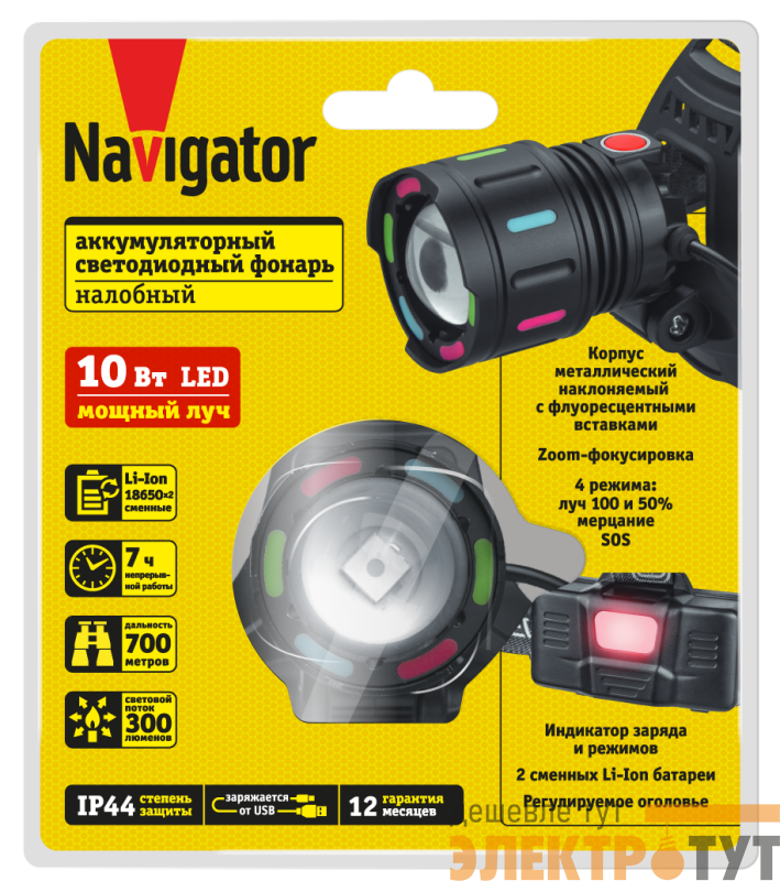 95560 | Фонарь аккумуляторный налобный 95 560 NPT-H44-ACCU 1LEDx10Вт 4реж Li-ion 2x1.2А.ч NAVIGATOR