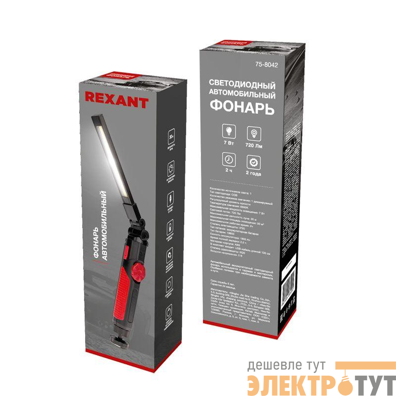 75-8042 | Фонарь автомобильный с регулировкой яркости поворотным магнитом индикатором зарядки и встроенным аккумулятором USB кабель в комплекте Rexant