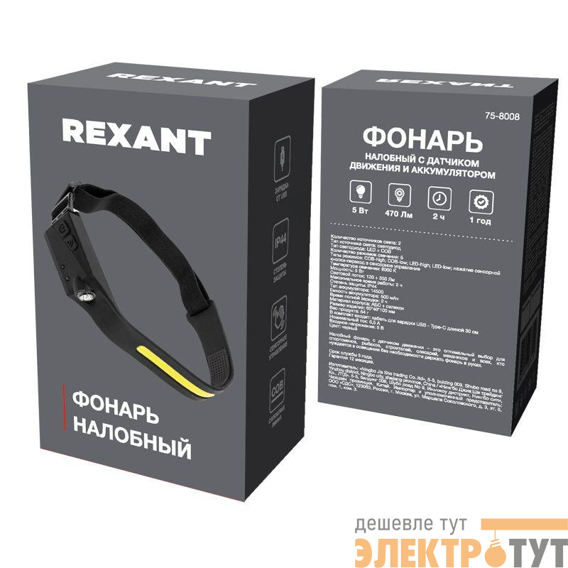 75-8008 | Фонарь налобный с датчиком движения и аккумулятором Rexant