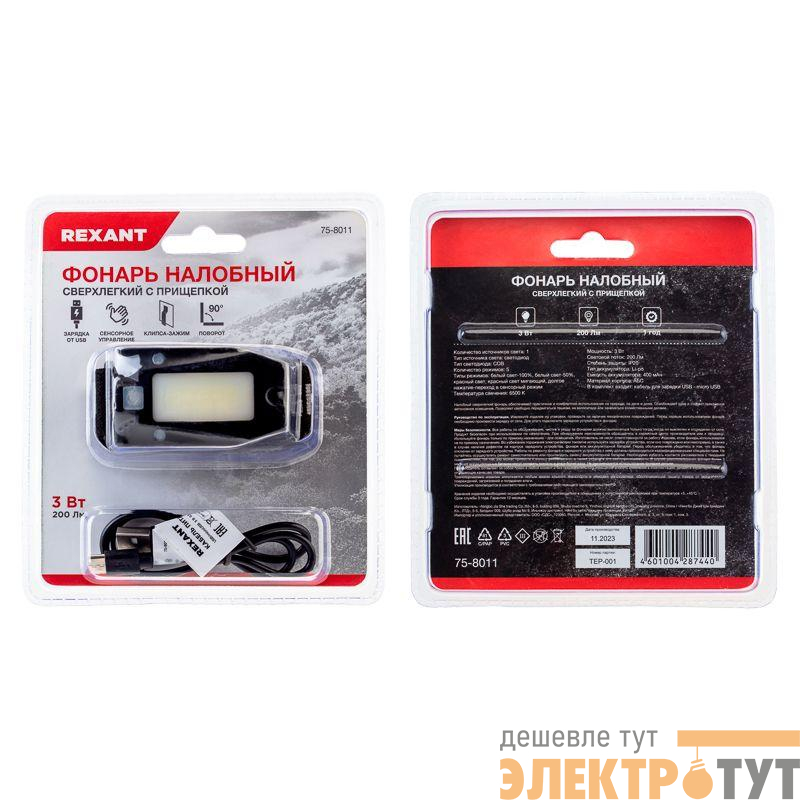75-8011 | Фонарь налобный сверхлегкий с прищепкой Rexant