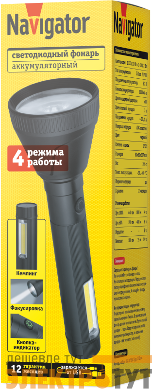 95741 | Фонарь светодиодный ручной 95 741 NPT-CP32-ACCU пласт. 1LED 10Вт+1COB 2Вт Li-Ion 3А.ч 4реж NAVIGATOR