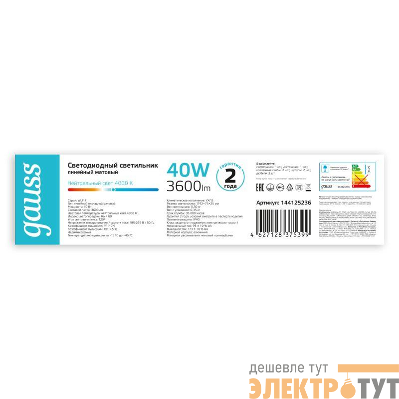 144125236 | Светильник светодиодный WLF-1 40Вт 4000К IP20 3600лм 1192х75х25мм ДПО линейный матов. рассеив. алюм. GAUSS