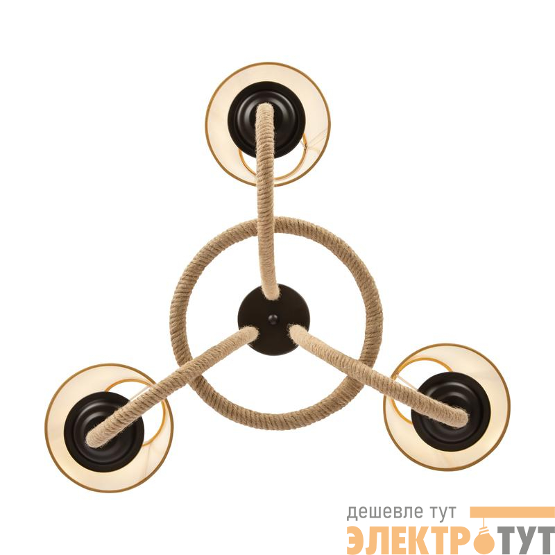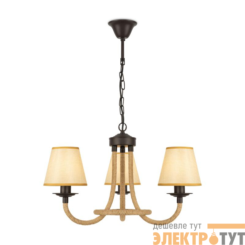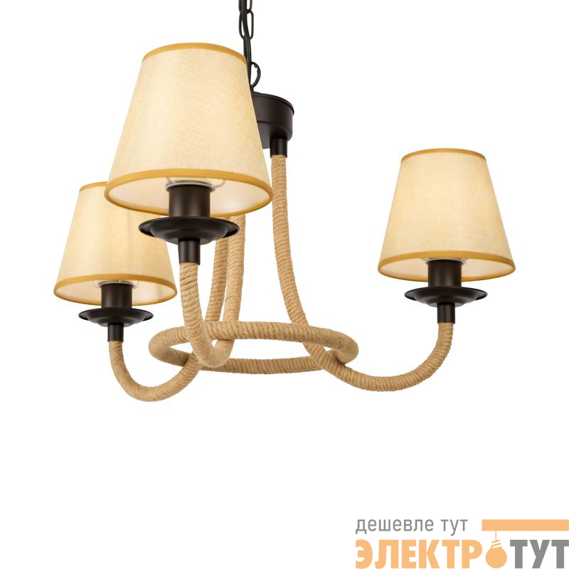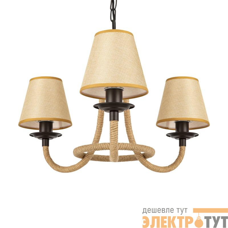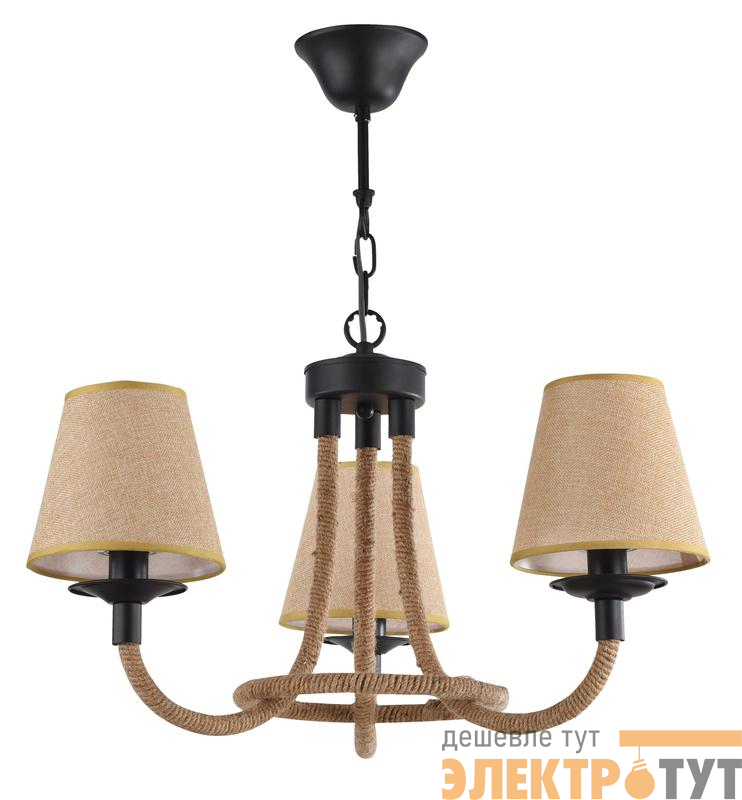 Серия светильников создана под влиянием основных принципов эко-дизайна, с использованием натуральных материалов для предметов интерьера. Арматура люстры из матового черного металла с легким золотым патинированием гармонично сочетается с абажурами из холщовой натуральной ткани. Рожки и центральная часть люстры плотно обвиты холщовой веревкой. Окантовка на верхней и нижней части абажура желто-песочного цвета.