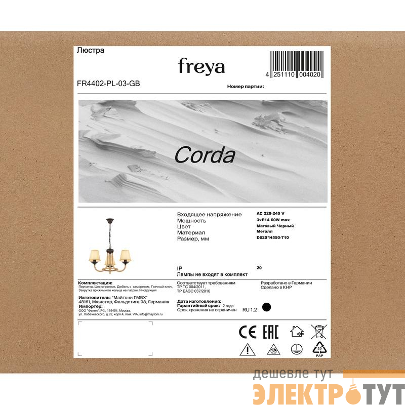 FR4402-PL-03-GB | Люстра Corda 60Вт E14х3 IP20 Freya